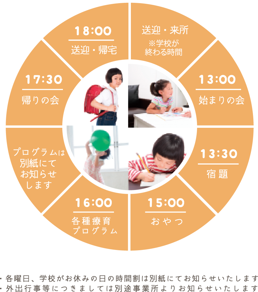 各曜日、学校がお休みの日の時間割は別紙にてお知らせいたします。